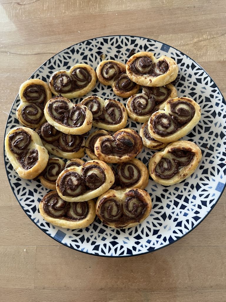 Hilfesmittel Zutaten Anleitung Zunächst muss der Blätterteig ausgerollt werden. Dann wird der Blätterteig mit Nutella bestrichen. Jetzt wird von zwei Rändern aus zur Mitte aufgerollt. Damit das Schneiden leichter fällt, wird der Blätterteig jetzt für 15 Minuten in den Kühlschrank gelegt. Nach dem Abkühlen, werden 1 cm breite Streifen abgeschnitten.Optional kann man die Streifen mit gequirltem Ei einstreichen.Dann werden die Streifen für 15 Minuten im Ofen bei 180 Grad Umluft gebacken.
