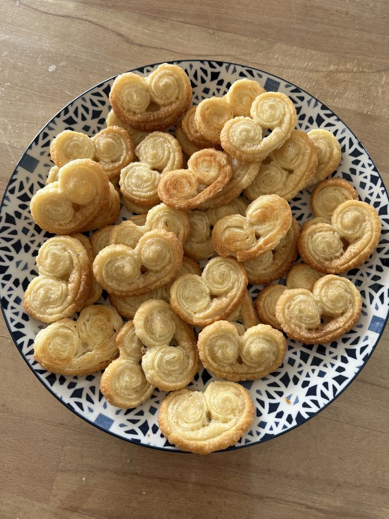 HILFSMITTEL ZUTATEN ANLEITUNG Zunächst muss der Blätterteig ausgerollt werden. Dann wird der braune Zucker auf einer Seite verteilt und eingedrückt. Anschließend wird der Blätterteig auf die andere Seite gedreht und es wird wieder Zucker verteilt und eingedrückt. Jetzt wird von zwei Rändern aus zur Mitte aufgerollt. Damit das Schneiden leichter fällt, wird der Blätterteig jetzt für 15 Minuten in den Kühlschrank gelegt. Nach dem Abkühlen, werden 1 cm breite Streifen abgeschnitten.Optional kann man die Streifen mit gequirltem Ei einstreichen.Dann werden die Streifen für 15 Minuten im Ofen bei 180 Grad Umluft gebacken.